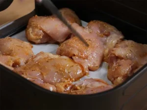 4. Now place the marinated chicken thighs in the basket lined with parchment paper, making sure they are arranged in a single layer without overlapping. Cook the meat at 200°C (400°F) for about 20–25 minutes, or until the chicken steaks are golden and fully cooked inside.