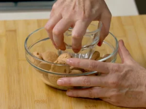 - We start by crumbling the amaretti in a bowl, using the bottom of a glass.