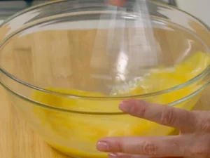 - In the meantime, we prepare the dough: in a large bowl we break the eggs and beat them with a whisk.