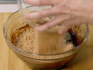 - We also add 150 grams of sugar, cocoa and rum, always stirring.