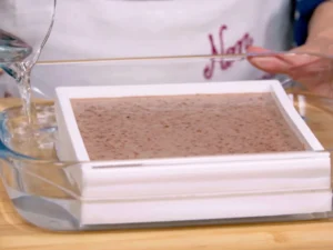 - We take a baking dish, put the mold in it with the mixture and pour the water into the baking dish until it reaches half its height. We bake and bake in a ventilated oven in a bain-marie at 160 degrees for about 60 minutes.