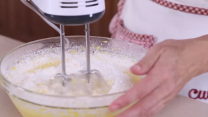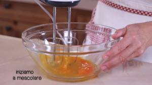 - To prepare the biscuits with a spoon, first of all we break the eggs in a bowl and start mixing with the electric whisks.