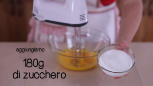 - Let’s now add the potato starch, a sachet of ammonia for sweets, the flour a little at a time and finally the chocolate chips, always continuing to mix with the whips.